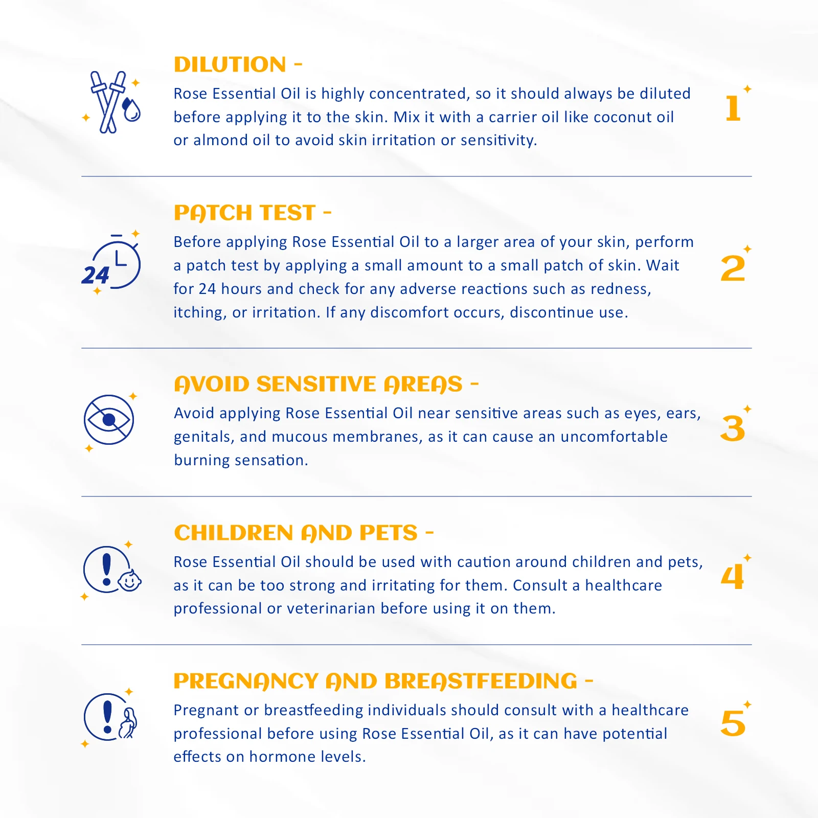 * PATCH TEST: Before applying Rose Essential Oil to a larger area of your skin, perform a patch test by applying a small amount to a small patch of skin. Wait for 24 hours and check for any adverse reactions such as redness, itching, or irritation. If any discomfort occurs, discontinue use.